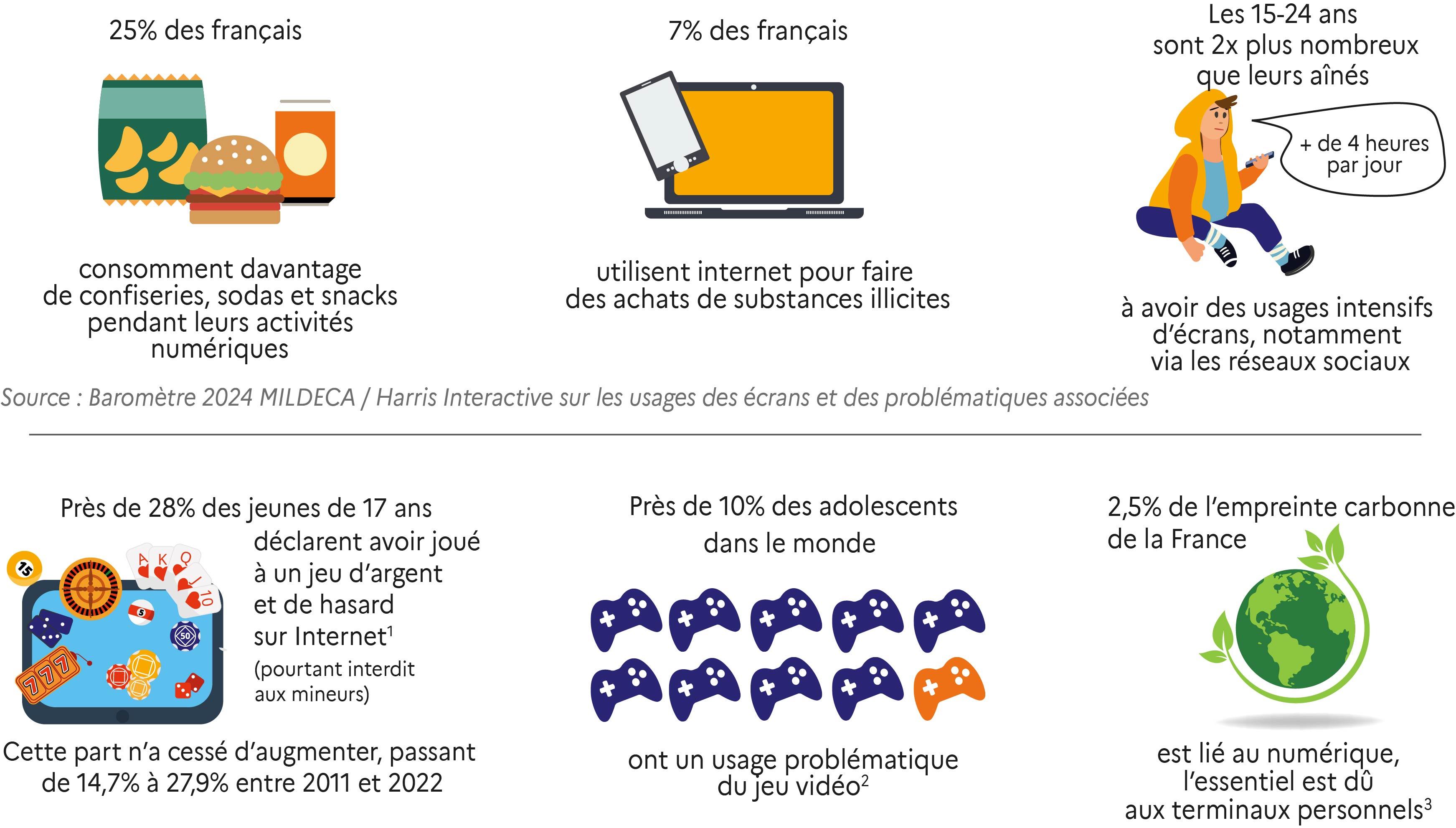 Ces pratiques numériques évoluent rapidement et entrainent de profonds changements de nos sociétés (modes de socialisation, loisirs, pratiques professionnelles, essor de nouveaux champs économiques, etc.). Si les écrans sont désormais incontournables, ils entraînent, à tout âge, des risques associés à des usages excessifs ou problématiques. Concernant les adultes, le cumul d’usages personnel et professionnel des écrans, accentué par le développement du télétravail, peut provoquer des impacts négatifs sur le bien-être et la santé mentale. Quel que soit l’âge, la pratique des jeux vidéo peut devenir problématique lorsqu’elle est associée à une perte de contrôle et affecte les autres domaines de la vie du joueur. Une majorité des sondés interrogés dans le Baromètre 2024 MILDECA / Harris Interactive sur les usages d’écrans et les problématiques associées déclare ne pas parvenir à diminuer ou arrêter leurs activités alors qu’ils souhaiteraient le faire***.